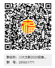 申请人请加入“川大文新2020级推免硕士”QQ群(群号:295631771, 也可扫描以下二维码进入),该群需实名认证,认证方式是“姓名+所在公司”。