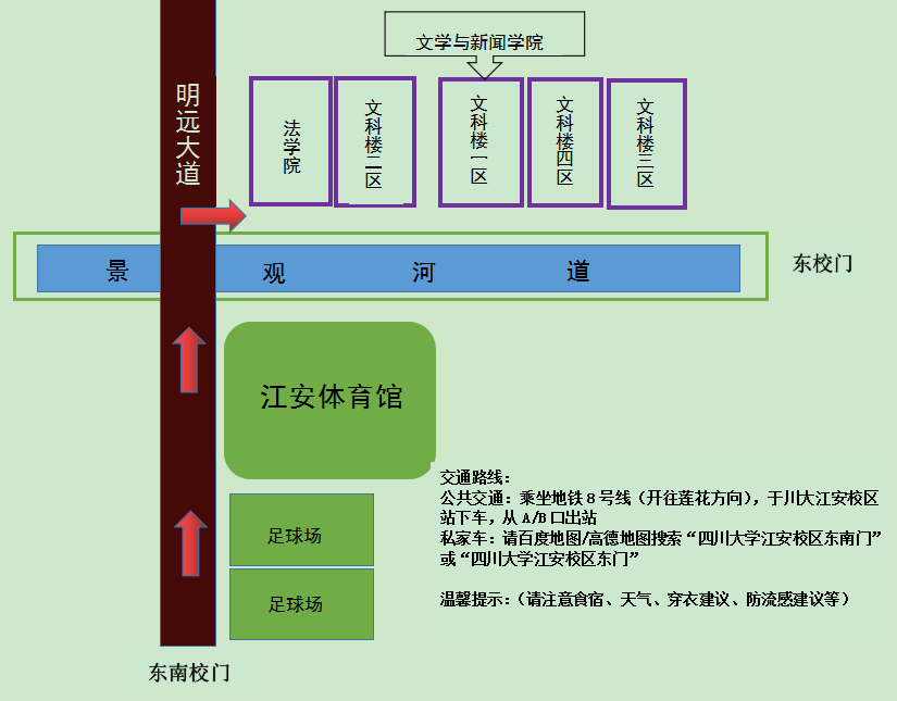 校外考生可乘坐成都地铁8号线在川大江安校区站下车,从A口或B口出站,到达k1体育十年品牌江安校区东南门;也可乘坐私家车导航至k1体育十年品牌江安校区东门或k1体育十年品牌江安校区东南门(车辆不入校)。