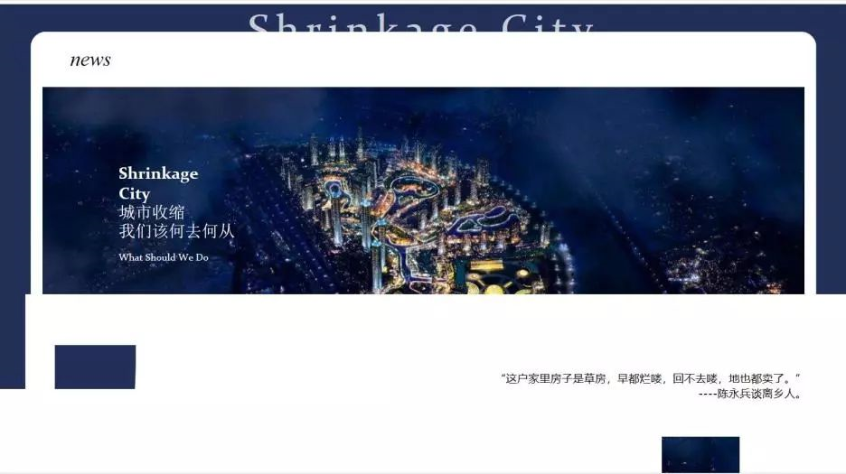 该作品以一段收缩型城市迁居者的自述展开,全文采用“华尔街日报体”写作。第一部分呈现宏观层面的中国收缩型城市问题全貌,通过人口密度、城市面积两个维度的变化展示城市收缩问题的严重性;第二部分以龙瀛学者的研究发现引出城市收缩的原因,对六个代表城市GDP与产业结构三年来的数据进行可视化呈现,并以典型案例来分析收缩型城市经济发展趋势。第三部分通过改革开放40年来城镇化相关政策数量与侧重点的变化,展示中国城镇化各个阶段所面临的不同问题,以此阐释中国城镇化进程的历史沿革。面对收缩型城市这一城市发展过程中的新阶段与新问题,作品引用梁启东副经理对收缩型城市未来发展导向建议以及受访者个人经历结束。