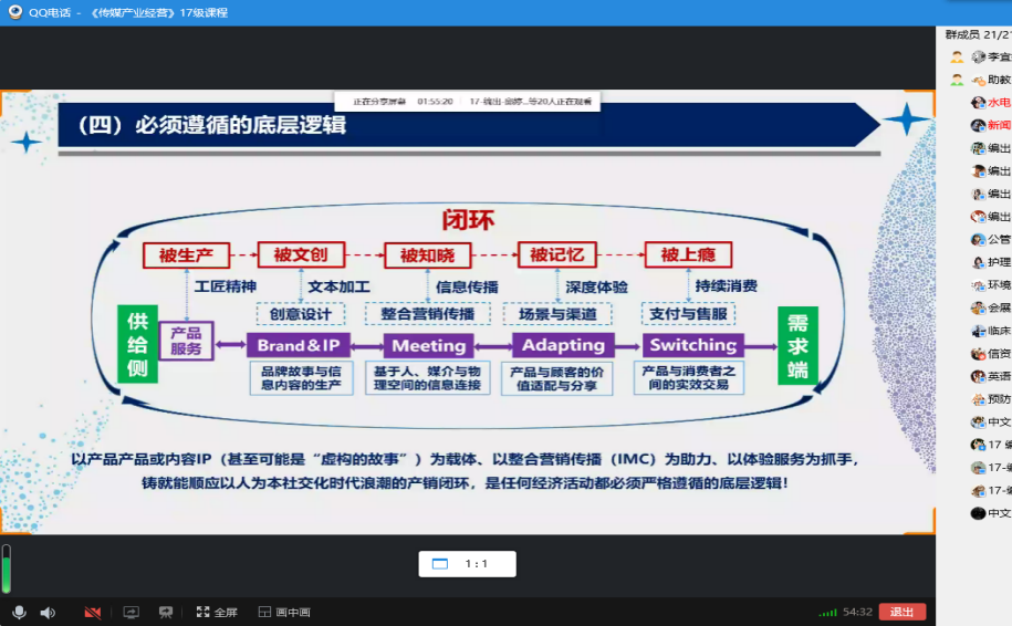 李宜篷老师的课程《传媒产业经营》采用QQ群直播(语音+屏幕分享)的方式,课堂秩序好。线上上课情况特殊,为保证同学们的上课率,他推行课前打卡。13:35分起,同学们就非常迅速地在群内完成了打卡签到,在两分钟的时间内就全员上线,快速地进入上课状态。课程全程讲解流畅,屏幕展示课件内容清晰,取得了良好的课程效果。课后同学们对于传媒产业运营有了更为系统化的理解,课程结束后,谢恩云同学在QQ群里提到“收获很多”。良好的课堂网络环境和内容充实的课程内容,令同学们学有所获。