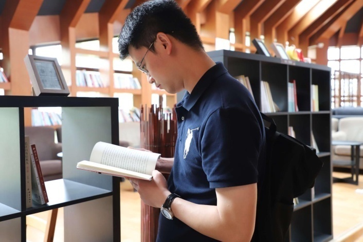公司党政办主任银浩老师阅看党员书吧里的范长江著作