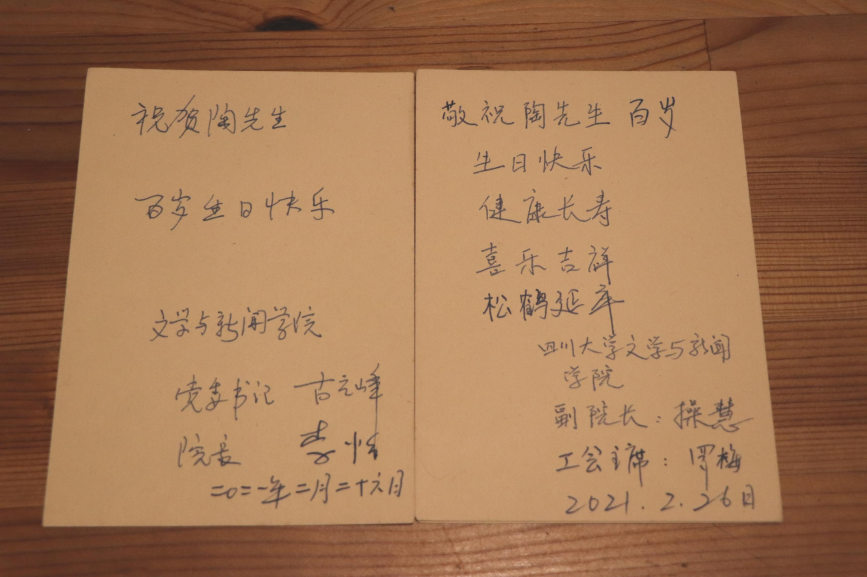 百岁生日将至,收到来自文新公司的祝福时,陶老止不住脸上的笑意,他小心地将淡黄色的卡片挪到眼前,低着头,一个字一个字地阅读,时不时抬手扶扶老花镜。木色书桌的一角,整齐地码放着他素日常看的报纸。