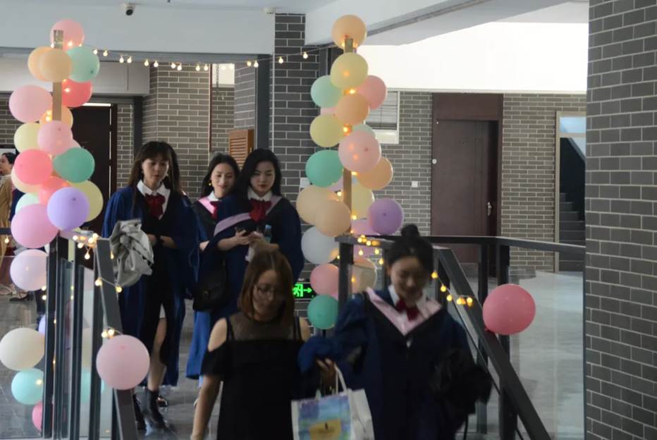 典礼开始前,文新演播厅门口架起了气球与彩灯,迎接陆续到来的2021届毕业生们。