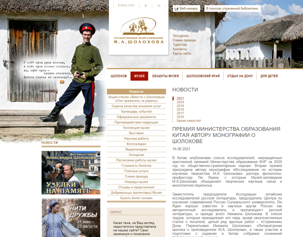 近日,俄罗斯国立肖洛霍夫故居博物院官网刊发题为《中国教育部授予肖洛霍夫研究者奖项》(ПремияМинистерстваобразованияКитаяавторумонографии о Шолохове)的新闻,详细介绍了公司刘亚丁教授关于肖洛霍夫的研究成果及其与俄方学界的交流经历,对其学术工作的意义予以高度评价。