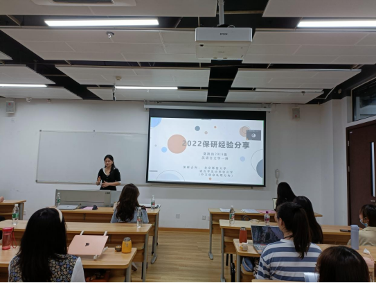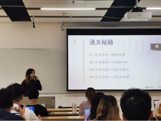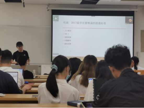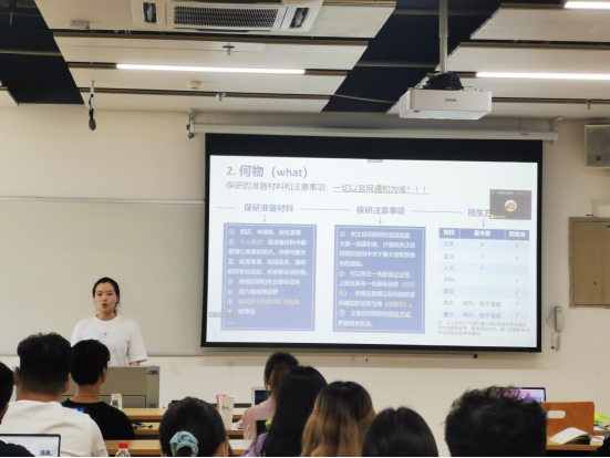 随后,经验分享环节正式开始。首先是中文专场,莫凯洁同学作为第一位分享同学从“知道保研是什么”“在保研中做了什么”两个问题开启了本次分享会之旅,她按照“三步走”的策略阐述了“目标确定”“步骤分明”和“行动办法”。牛童同学讲述了自己从国际知名暑校到成功保研的多彩经历,尤其是将出国留学准备工作和国内保研准备工作融合在一起,为同学们提供了针对性的借鉴经验。崔逸灵同学以“普通人保研指南”为题,生动形象地为面临保研焦虑的同学“开处方”“避禁忌”。向宇歌同学和王一丹同学分别用时间轴的方式展示了自己保研过程中的具体安排,为大家梳理了更加清晰的时间管理步骤,并介绍了部分公司的夏令营时间安排和部分公开的面试流程。赵嘉宁同学则先是讲述了自己在保研路上曲折但激励人心的故事,后又无私分享给大家详细的资源清单。彭笑秋同学以录制视频的方式为大家分享保研路上的几个关键步骤“发现兴趣-收集信息-明确定位-供需对接”的心得,十七分钟的视频充满干货。