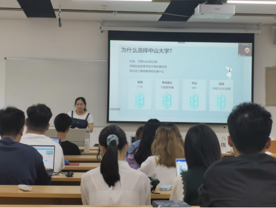 在新闻传播专场分享中,另有八位同学分享了自己的保研经验。周祺蕙同学以“保研攻略”的方式生动有趣地向同学们展示了自己的保研历程,就院校选择、专业选择等问题给出了自己的见解,鼓励同学们与焦虑和解,拒绝恶性竞争。尹梦奇、李萌、徐紫菱三位同学则就保研细则、保研流程、各院校特色给出了自己的见解。梁昊晨同学保研至中国人民大学新闻学专业,他在前面几位同学分享的基础上,以“做自己”为主题舒缓了同学们面对保研的焦虑心态。为什么需要硕士学位?为什么要做自己?如何找到自己?梁昊晨同学借这几个问题建议同学们要思虑清楚再做选择,“他强任他强,清风拂山岗”,不要一味地“内卷”。保送至中山大学的易思思同学从自己踩过的“坑”讲起,为大家指出面临困难时应如何解决。从汉语言文学跨保到本校网络与新媒体的王雨枫同学则分享了诸多“干货”,保研路上遇到过的所有压力与困难、专业课复习与面试的指南,她都一一为同学们列出。最后,王雨枫同学回望自己的保研经历,总结经验,希望同学们平和看待保研,不要关心“社会的标准”,而是去关心自己做了什么。保送至武汉大学的李佰珏同学也通过线上共享PPT介绍了自己的基本情况,留下了联系方式方便学弟学妹们联系。