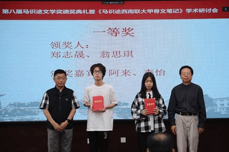 与会嘉宾、学者为获得第八届“马识途文学奖”的同学颁发了获奖证书并合影留念。本届有21位同学获奖,其中一等奖2人,二等奖4人,三等奖15位。