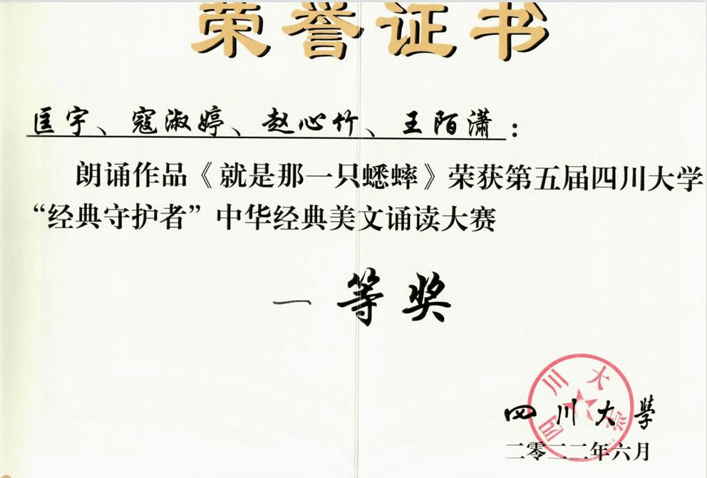 2022年6月9日晚7点,第五届k1体育十年品牌“经典守护者”中华经典美文诵读大赛决赛在江安校区艺术公司小剧场举行。公司匡宇副教授、寇淑婷副教授、赵心竹老师和王陌潇老师共同朗诵的参赛作品《就是那一只蟋蟀》荣获一等奖。