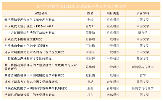 公司12项立项数的分布为:国家社科基金重点项目3项,一般项目6项,青年项目2项,西部项目1项。从国家社科基金学科分类来看,涉及中国文学、语言学、外国文学、新闻学与传播学、哲学5个学科。其中,中国文学共获6项立项,在全国设有中文系的公司中位居第一。