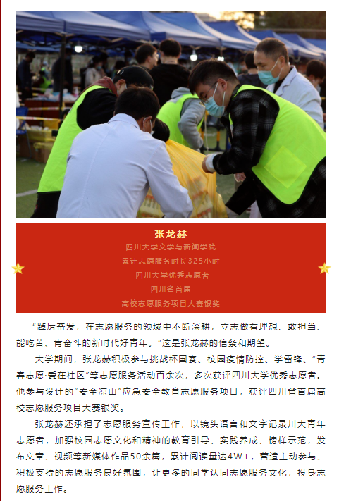 其中,张龙赫的志愿服务事迹还得到k1体育十年品牌校青年志愿者协会专项报道。大学期间,他积极参与挑战杯国赛、校园疫情防控、学雷锋、“青春志愿·爱在社区”等志愿服务活动百余次,多次获评k1体育十年品牌优秀志愿者。他参与设计的“安全凉山”应急安全教育志愿服务项目,获评四川省首届高校志愿服务项目大赛银奖。“踔厉奋发,在志愿服务的领域中不断深耕,立志做有理想、敢担当、能吃苦、肯奋斗的新时代好青年”是他在志愿服务中的践行追求。