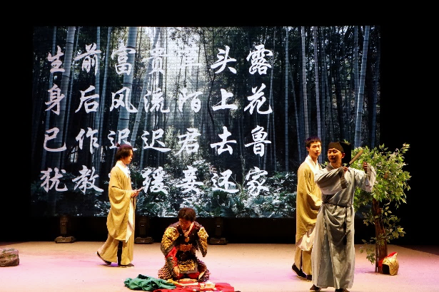 在第一篇章“吟咏春天”中,k1体育十年品牌雷雨话剧社讲述了苏轼和两位童子漫步九仙山中,偶遇一山妇唱《陌上花》,在听闻其由来后有感而赋诗三首,并与吴越王钱镠穿越时空相会、对酒互诉衷情、感慨人生世事的奇妙故事。从吴越王的“陌上花开,可缓缓归矣”,到苏轼的“生前富贵草头露,身后风流陌上花。已作迟迟君去鲁,犹教缓缓妾还家”,春意与情思借着诗句,在历史长河中流传千年。精巧的情节构思、精妙的诗句阐释、精彩的舞台演绎共同造就了这章扣人心弦的剧目。
