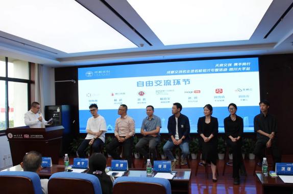 活动尾声,成都天府文创金融科技有限公司副总经理刘锋担任主持人,邀请来自七个企业的代表上台,与现场同学进行自由交流,进一步说明校企合作意向。