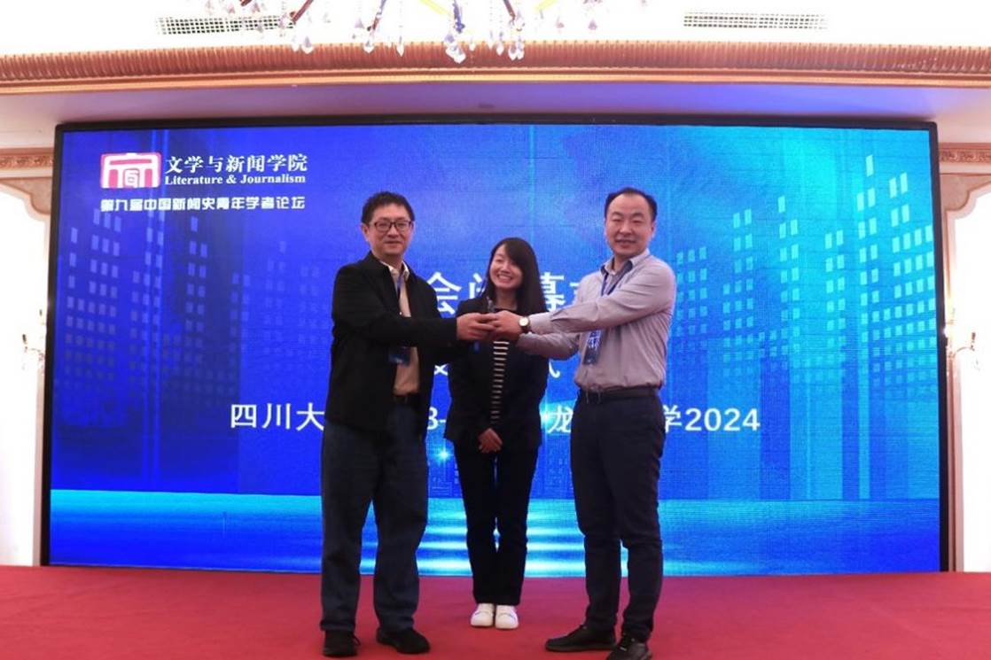 在闭幕交接仪式上,k1体育朱至刚教授、黑龙江大学k1体育田雷教授和k1体育新闻与传播研究所向芬研究员共同完成了论坛吉祥物的交接。田雷教授代表第十届中国新闻史青年学者论坛承办单位诚邀与会学者来年相聚哈尔滨。