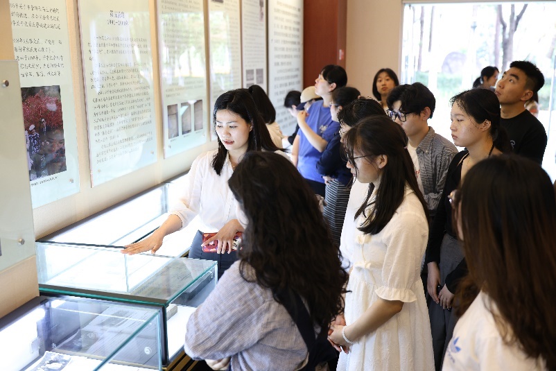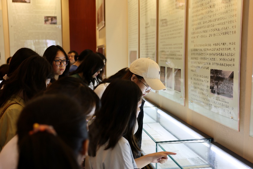 此次研学行的首站是新华社四川分社社史陈列室。伴随新华网股份有限公司四川分公司工作人员蒋燕的讲解,公司师生共同走进了新华社四川分社从新华社川西分社发展至今的八个阶段。陈列室内,33年前今时今日的活动日程为我们再现了记者们乘坐飞机前往西昌视察卫星发射基地和民族乡的身影。玻璃展柜中退休老记者的记者证和获奖证书、泛黄的旧报纸以及军绿色的工作马甲见证了过往新闻工作的精彩瞬间,同样也记录着新华社四川分社的发展。
