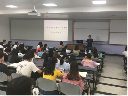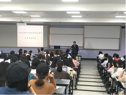 为了贯彻公司办学理念,实现专业人才培养目标,5月10日下午,公司就专业分流相关事宜分别向中国语言文学类和新闻传播学类的2018级本科生进行了宣讲。公司党委副书记张莹老师、文艺学教研室主任阎嘉教授、语言学与汉语国际教育教研室主任李宇凤副教授、广播电视学教研室李宜蓬老师、广告学与符号学教研室主任饶广祥副教授、传播学与新媒体教研室主任张悦副教授、编辑出版学教研室曾元祥副教授出席了本次宣讲会。宣讲会由2018级本科生辅导员杨珊老师主持。此外,新闻学教研室主任陈雪奇教授和部分教师在教师休息日里,已就专业分流问题进行了解答。