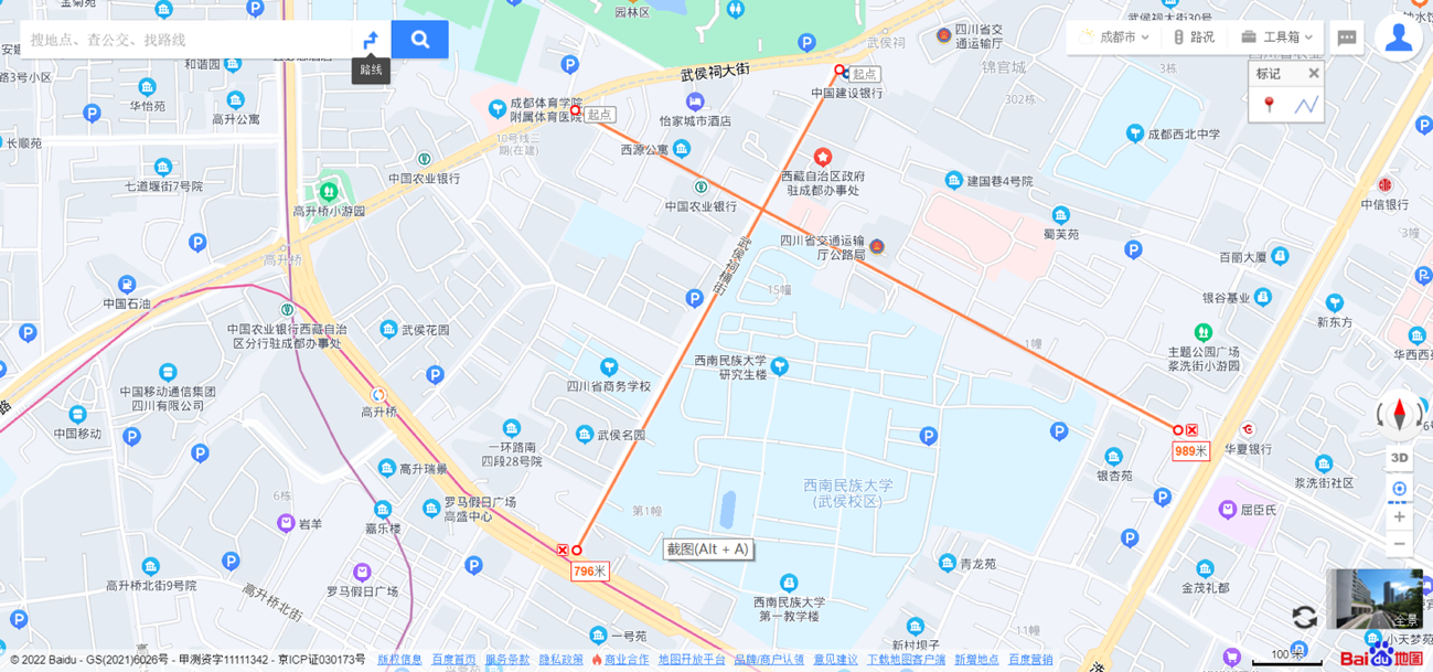2023年1月27日上午,为具体研究街区的建筑特色与空间利用,调研队成员、建筑学专业同学周荣根据地图与实地勘测,划分藏族移居文化空间范围,包括洗面横街与武侯祠街的交汇口,东至西南民族大公司区内部,西至武侯祠大街,北至武侯祠大街中国建设银行,南至武侯祠横街藏医商城。