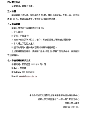 2022年12月8日,中华多民族文化凝聚与全球传播省部共建协同创新中心与成都大学文明互鉴与“一带一路”研究分中心协同共建成都大学博士后创新实践基地,并联合发布协同培养成都大学博士后创新实践基地文学学科博士后招聘启事,面向社会公开招聘文学学科专职博士后1名。