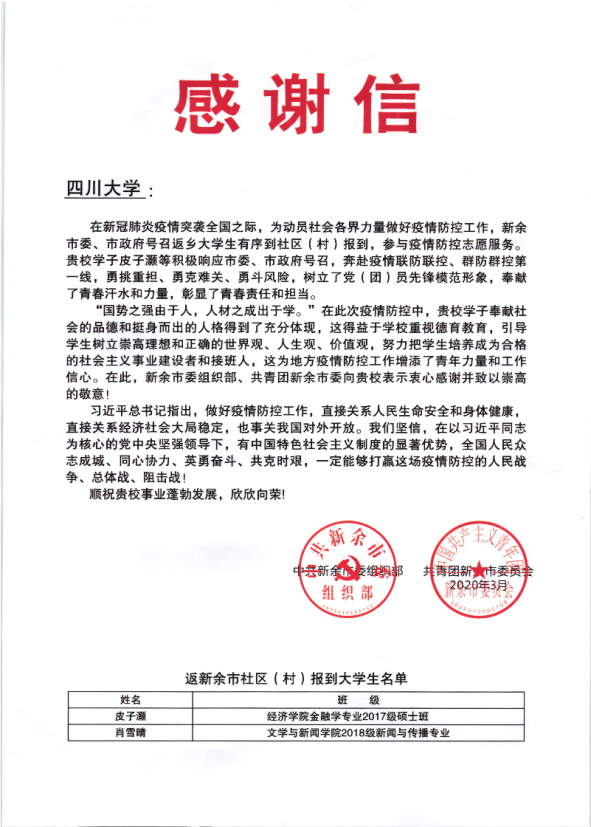 3月25日下午,新余市水西镇柏树下村老员工志愿者、k1体育新闻与传播专业2018级硕士研究生肖雪晴,接到该市新冠肺炎防控指挥部送来的表扬证书时,显得些许腼腆。