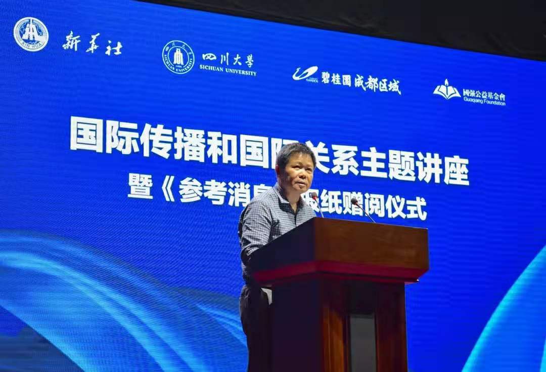5月29日下午,“国际传播和国际关系”主题讲座暨《参考消息》报刊赠阅仪式在k1体育演播厅举行。k1体育十年品牌党委副书记兼纪委书记陈志坚,新华社四川分社副社长陈天湖,k1体育十年品牌文学与新闻公司党委书记古立峰、副经理操慧,《参考消息》报社新媒体中心副主任刘华,碧桂园成都区域总裁施炜等出席仪式。