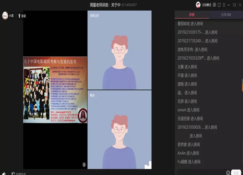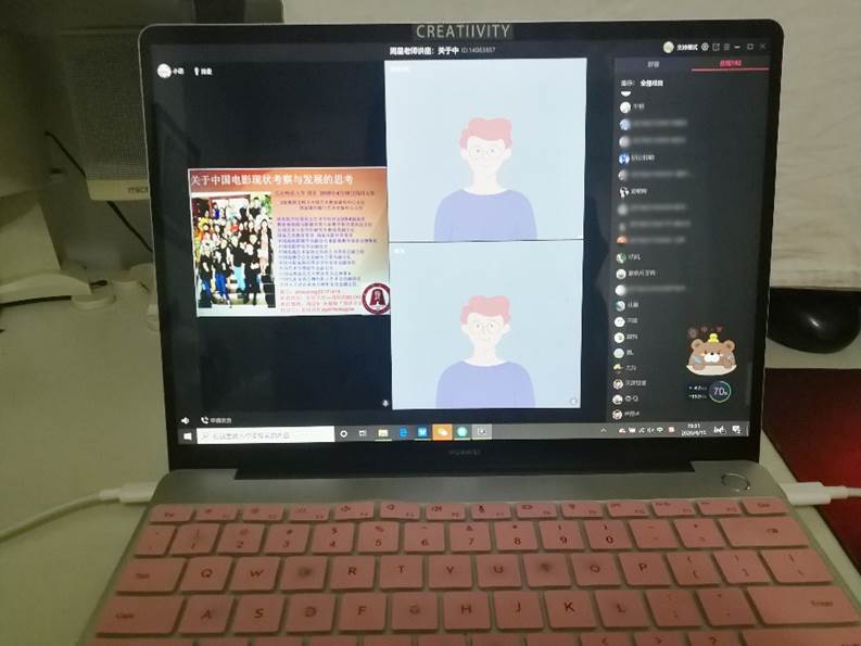 4月15日19:30,“云端锦江”系列学术讲座第十九场通过QQ群课堂顺利举行。教育部高校戏剧与影视学类教学指导委员会主任、原北京师范大学艺术与传媒公司经理、博士生导师周星教授,应邀作“关于中国电影现状考察与发展的思考”的主题讲座,公司曹峻冰教授任主持人,院内外共240余名师生在线参与。