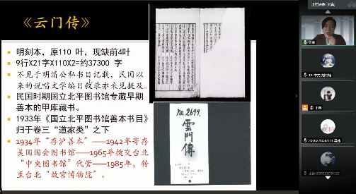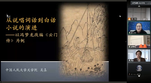2020年10月15日下午3:30,中国人民大学文公司吴真教授应邀作题为“从说唱词话到白话小说的演进——以冯梦龙改编《云门传》为例”的在线主题讲座。公司丁淑梅教授任讲座主持人,公司内外300余名师生在线参与。
