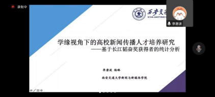 西安交通大学博士研究生李唐以《学缘视角下的高校新闻人才培养研究》为题发言。他收集并分析了2007年至2020年间共199位长江韬奋奖获得者的信息并进行了分析,提炼出开展新闻教育的建议:应明确新闻传播专业教育与成才培养间的密切关系、构建跨专业融合育人模式、拓展员工丰富而深厚的社会知识与体验、合理配置人才培养资源。