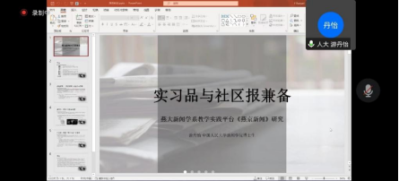 中国人民大学博士研究生游丹怡以《实习品与社区报兼备:燕大新闻学系教学实践平台<燕京新闻>研究》为题发言。《燕京新闻》是开展新闻实践教育,新闻教育理论联系实际的象征,游丹怡通过挖掘历史细节,从其作为实习品和社区报两个方面,分析了该自办新闻专业学习教育平台。她认为《燕京新闻》的历史为校园媒体的建设提供了启发。
