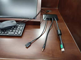 为方便操作,此会议室设有2组HDMI和音频输入线接口,分别位于演讲台,第一排靠窗位置。如下图所示;