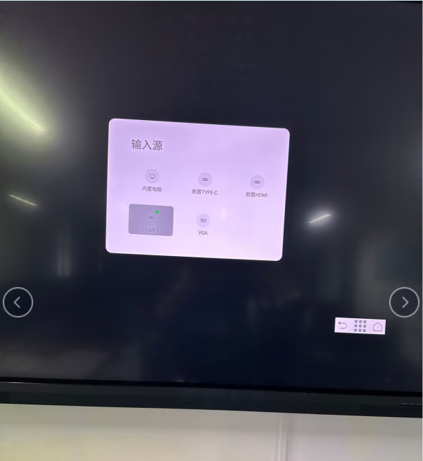先按“信源”按钮,显示如下界面,然后按遥控板上下,切换到HDMI1,按遥控板上“确认”按钮,即可将讲台电脑的屏幕同步到联想一体机。
