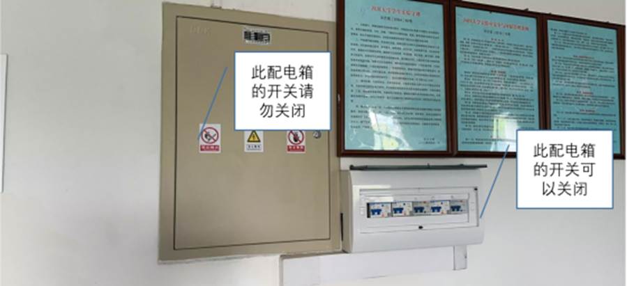 1、打开教室前后两个配电箱的所有开关,注意,在离开时请勿关闭铁皮盖配电箱的开关,仅可关闭裸露在外的开关