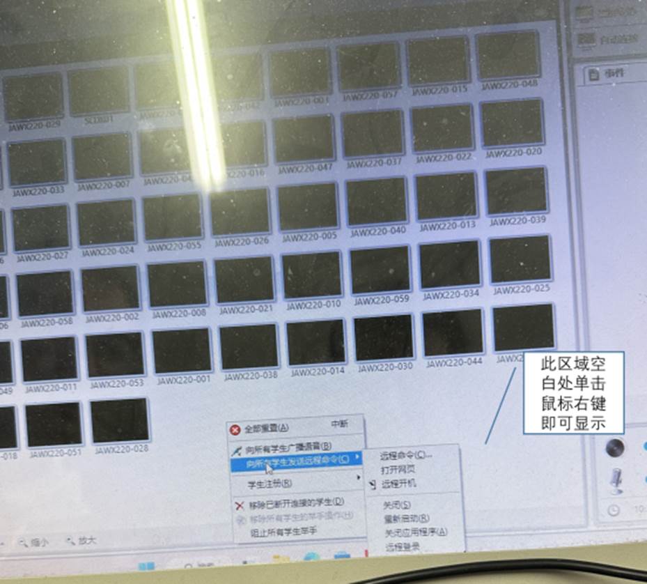 5、如需关闭所有员工电脑,先解除屏幕同步,然后在界面上空白处单击鼠标右键,选择“向所有员工发送远程命令”,然后选择“关闭”,确定后可依次关闭所有员工电脑,待所有员工电脑关闭后,可关闭讲台电脑。